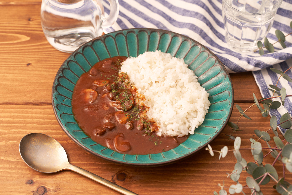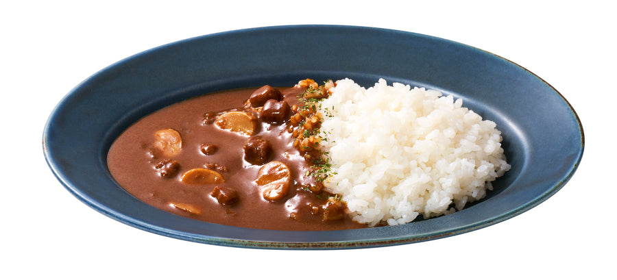 謎肉×マッシュルーム入り。バターの風味とスパイスの香りをきかせて濃厚でマイルドなルゥに仕上げた欧風カレーライス!