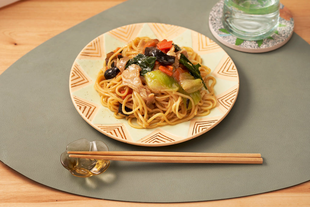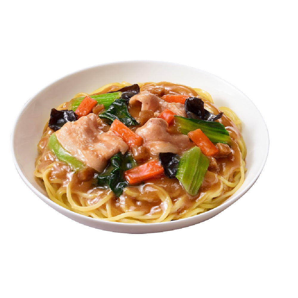 香り立つごま油とオイスターソースのコクがきいた、五目あんかけ焼そば。豚肉、きくらげ、人参、たけのこ、チンゲン菜入り。