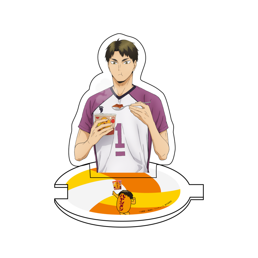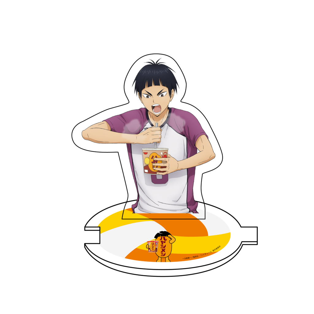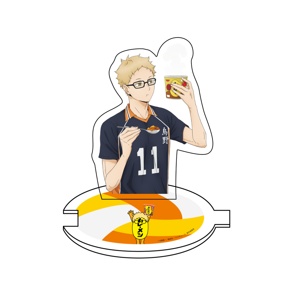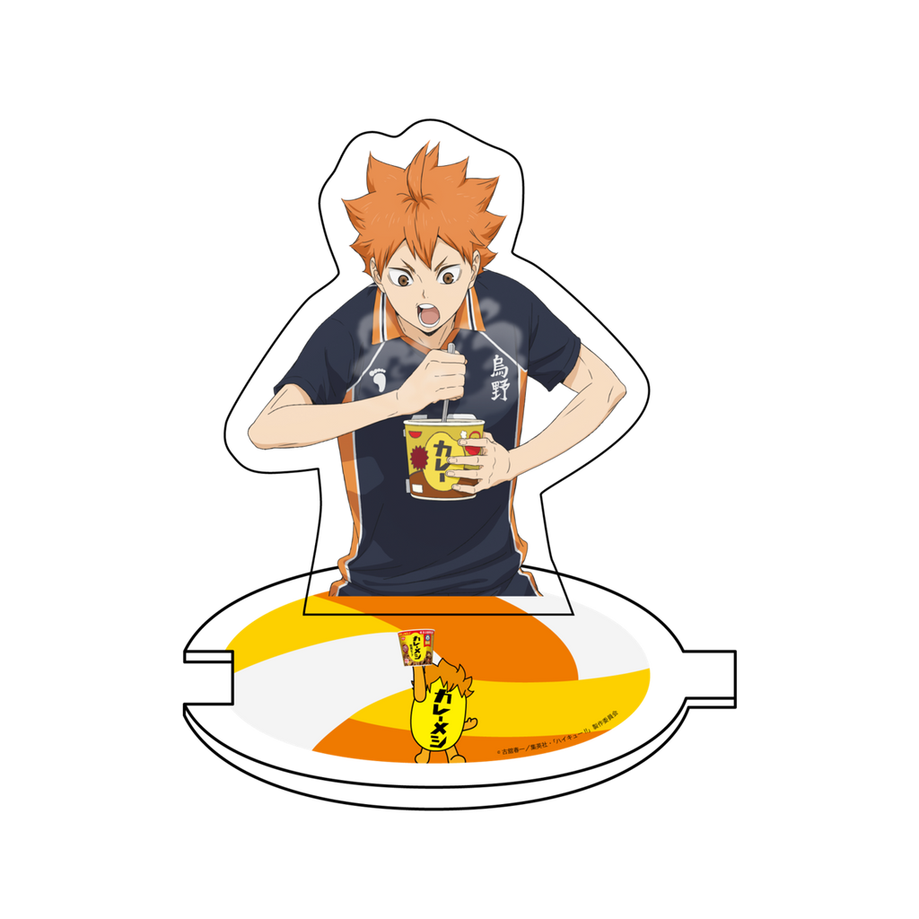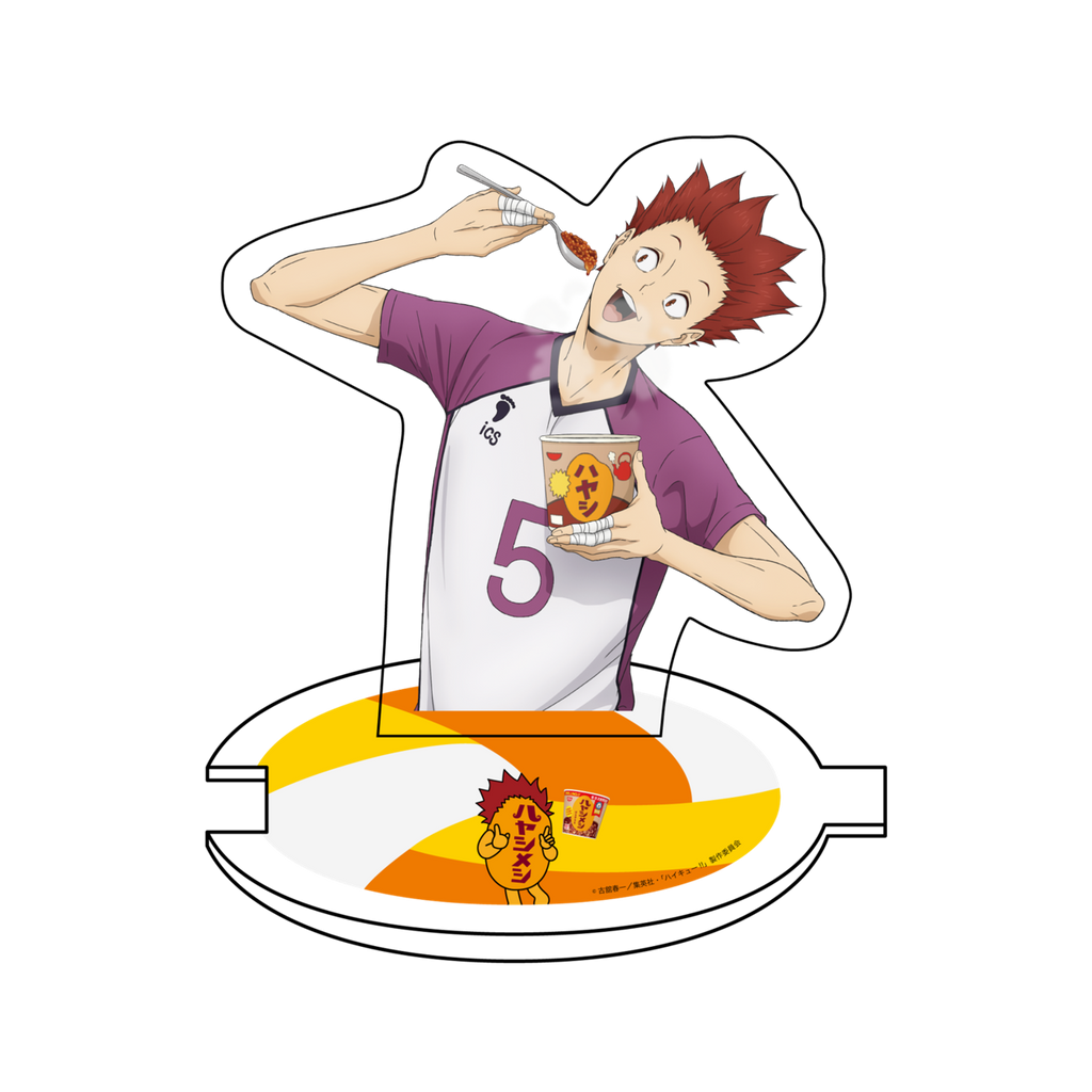 大人気漫画「ハイキュー!!」とカレーメシのコラボセット! お湯を注いだ後の待ち時間が楽しくなるアクリルスタンドフタ止め全6種とカレーメシ12食のセットです。