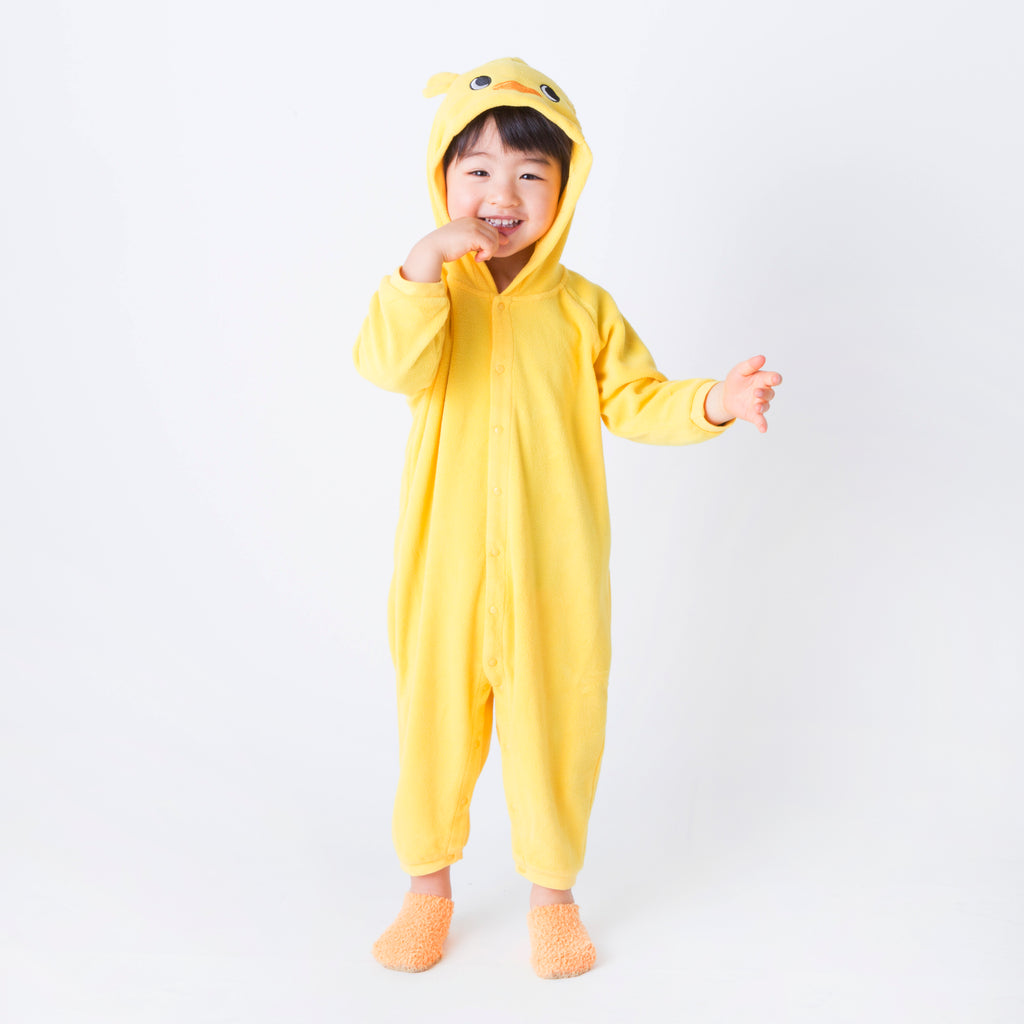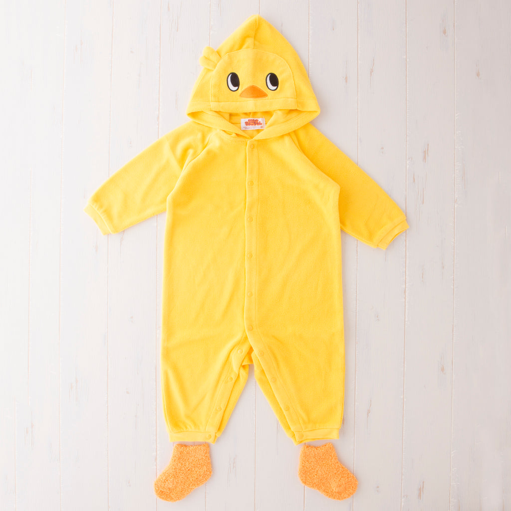 【オンラインストア限定】着るだけで簡単に愛らしいひよこちゃんになれる着ぐるみです。オレンジ色のモコモコ可愛い靴下付き。 フードはひよこちゃんの顔になっています。薄めのフリース素材で出来ていますので、洋服の上からも着せやすいです。 こんな可愛いひよこちゃんがいたら周りの視線を集めること間違いなしです! (本商品は80cmサイズです。