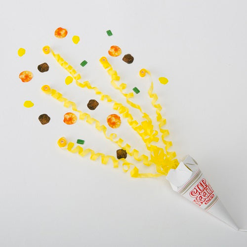 カップヌードルデザインの本体から麺に見立てた、紙テープと具材風の紙吹雪が勢いよく飛び出すクラッカー。
