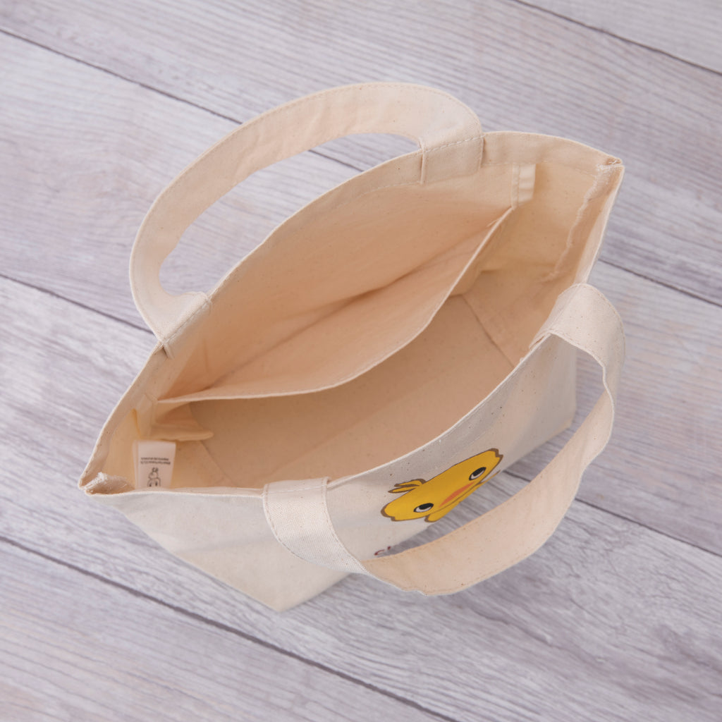 ひよこちゃんのマチありランチトートです♪お弁当箱とペットボトルが入るサイズで、ランチバッグに最適!(500ml程度のペットボトルを想定しております)