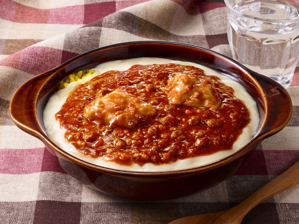 トマトベースの旨みに、セロリやナツメグの風味を加えた濃厚な“ミートソース”、モッツァレラチーズ風味をプラスしたコク深いクリーミーな“ホワイトソース”のWソースを、黄金色のライスにたっぷりとかけています。やわらかいチキンもごろっと入っています。