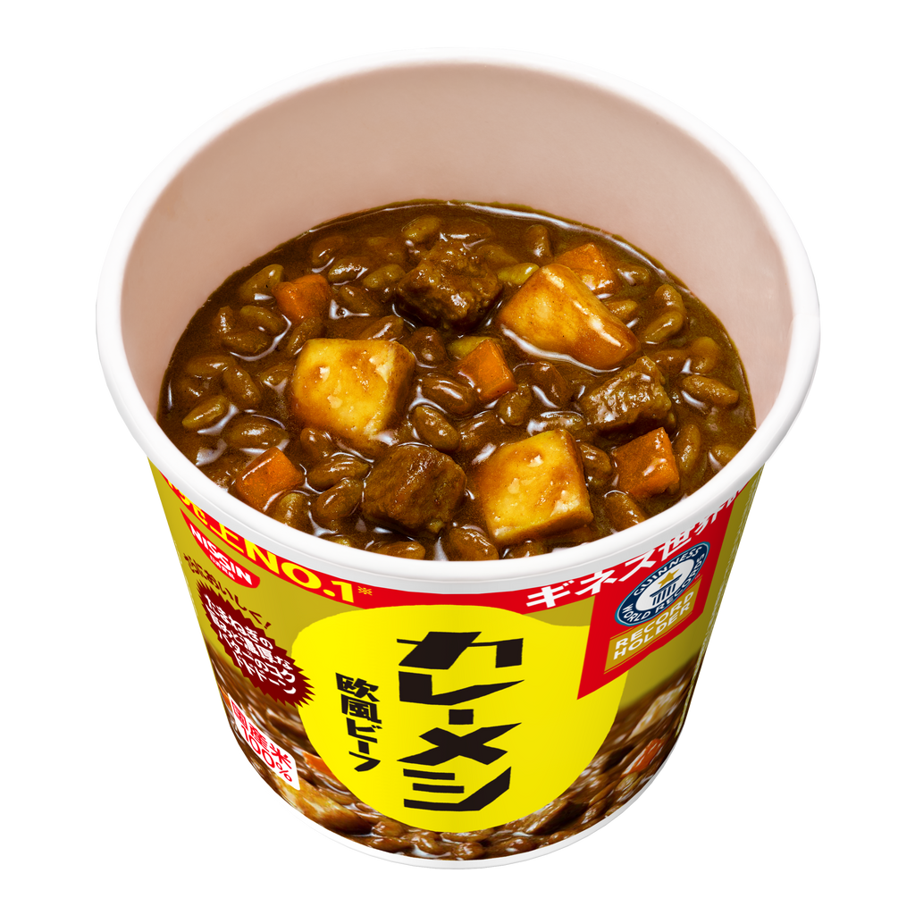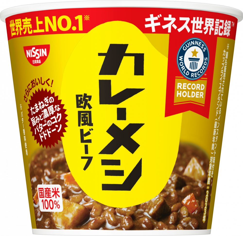 カレーメシビーフがリニューアル!バターの風味とスパイス感がアップし、さらに美味しい欧風ビーフカレーになりました。世界一売れている即席カップライスとしてギネス世界記録も獲得した一品をぜひご賞味ください。