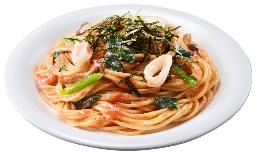 粒立ちのしっかりとしたたらこに、和風だしを使用し、バターを隠し味として使用することで、味わいに深みを出したソースが特長の和風パスタです。やりいか、ほうれん草、ブナシメジ3種の具材を使用しています。別添の風味豊かなきざみ海苔をかけてお召し上がりください。