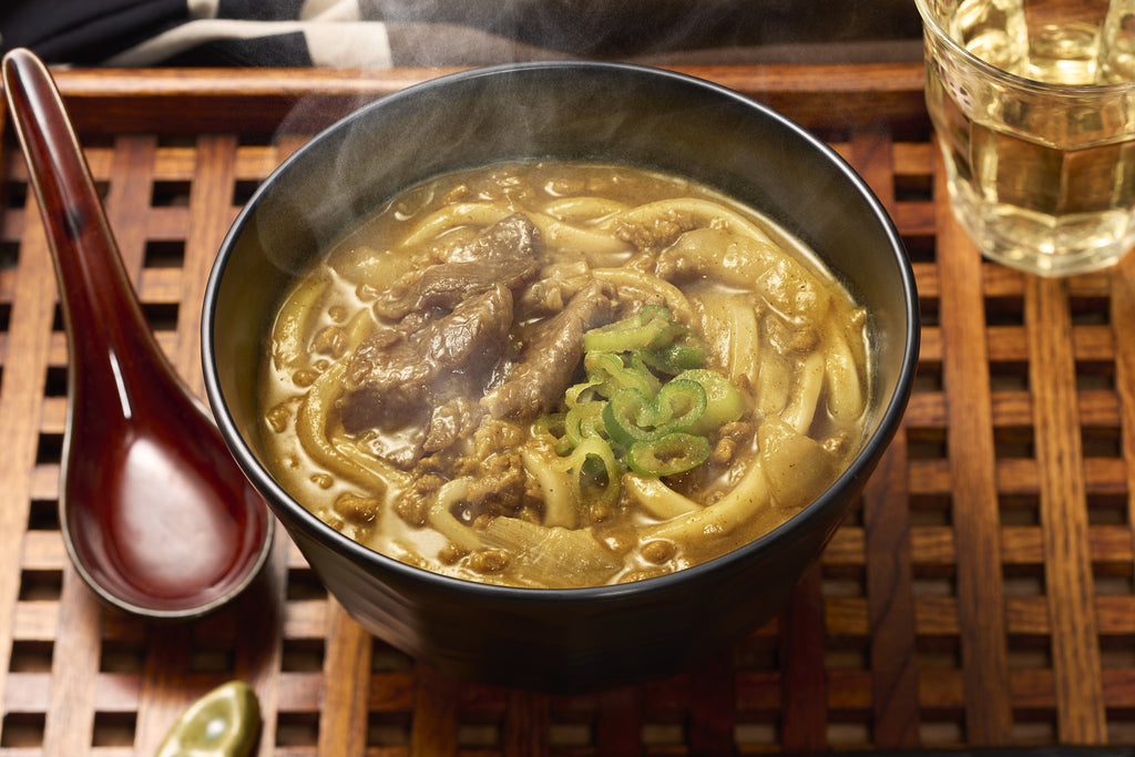 和風だしをきかせた濃厚なカレーつゆが特長です。鰹と昆布のWだしのうまみとスパイスのほどよい辛みが調和した、最後の一滴まで飲み干したくなるカレーうどん。具材には牛肉、タマネギ、ネギを入れました。