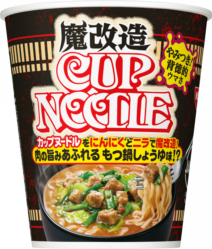 「カップヌードル」のスープをベースに、にんにくとニラの風味、肉の旨み、野菜の甘みをきかせた "もつ鍋しょうゆ味"。具材は、"謎肉"、キャベツ、ニラ、ごま、背脂。