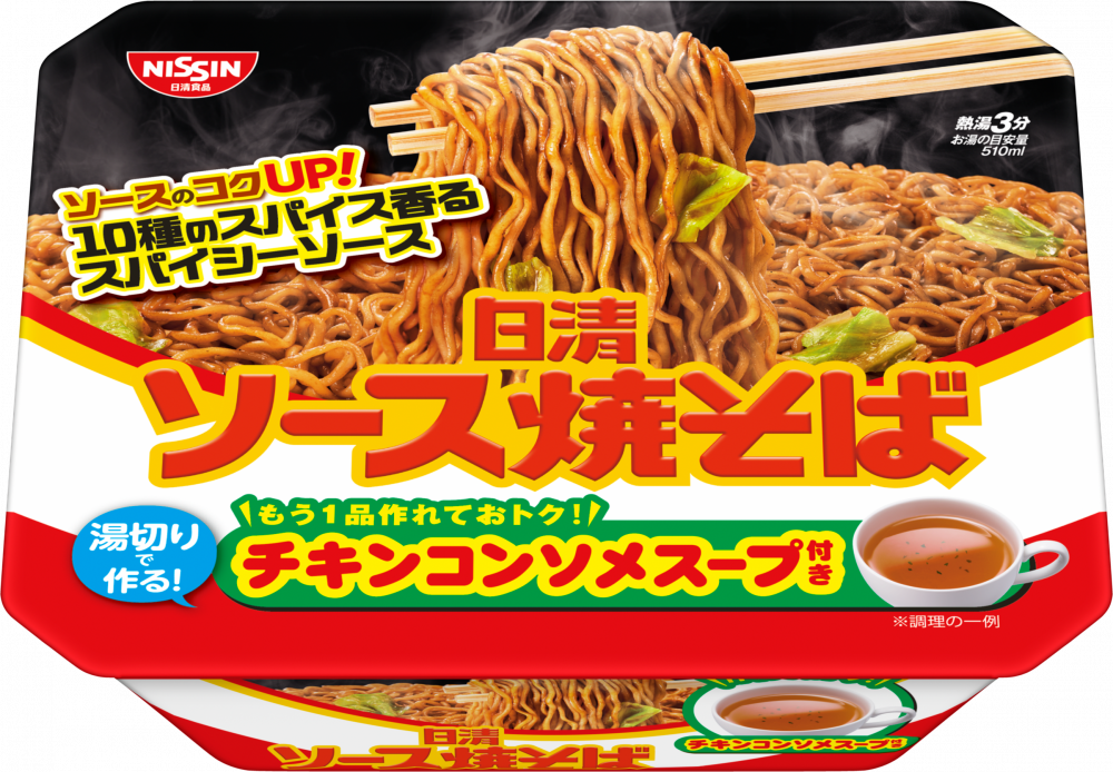 スパイシーでコク深い味わいのソースが決め手。湯切りのお湯で作る、チキンとオニオンのうまみがきいたチキンスープ付きで大満足の一品です。