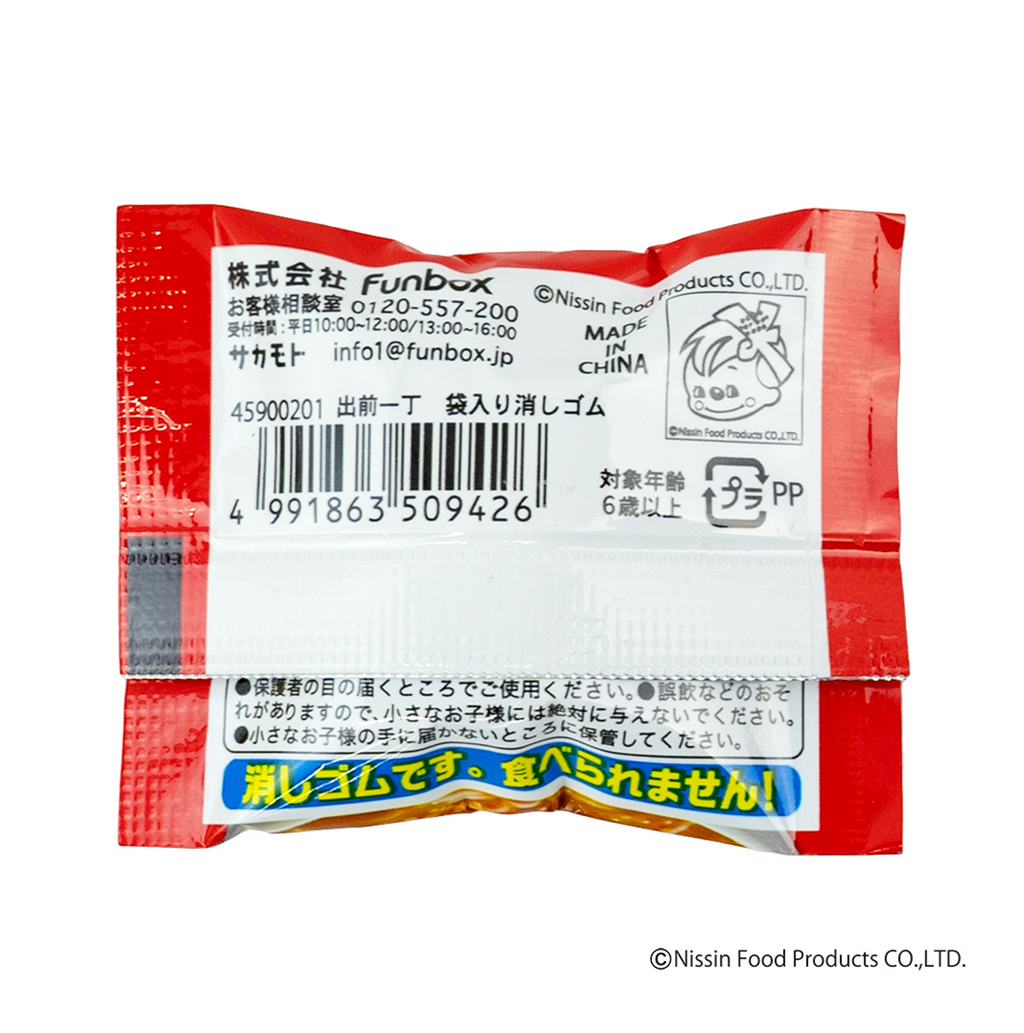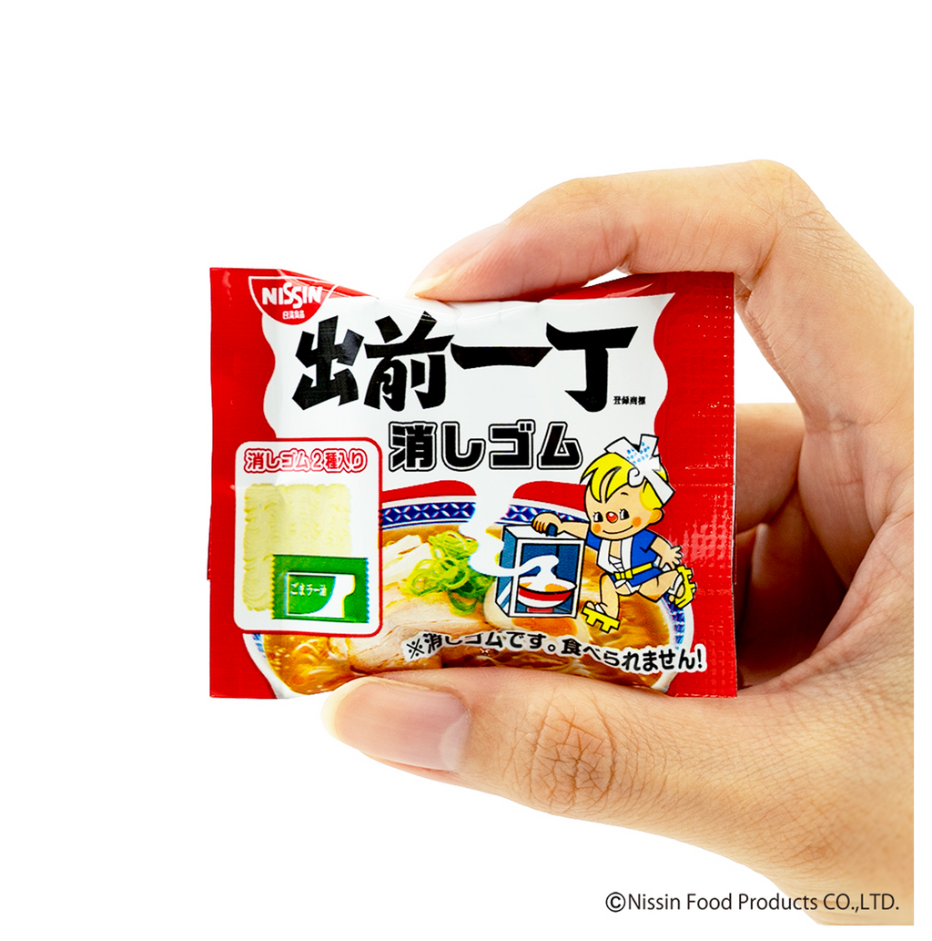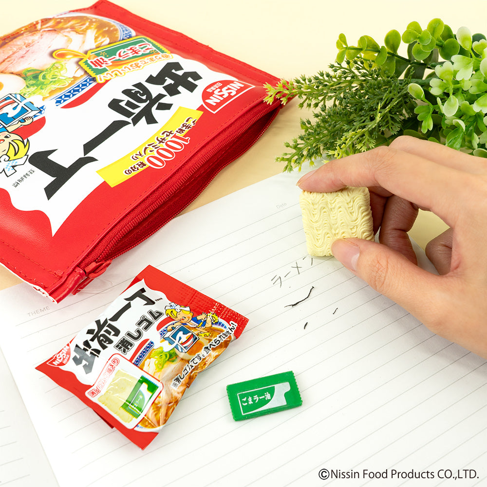 「出前一丁」といえばごまラー油!ということで、リアルを追求するため、ごまラー油型の消しゴムを作ってしまいました…。 本物がそのままミニチュアになったようなパッケージに、麺型とごまラー油型の消しゴムの2つがセットで入っています。