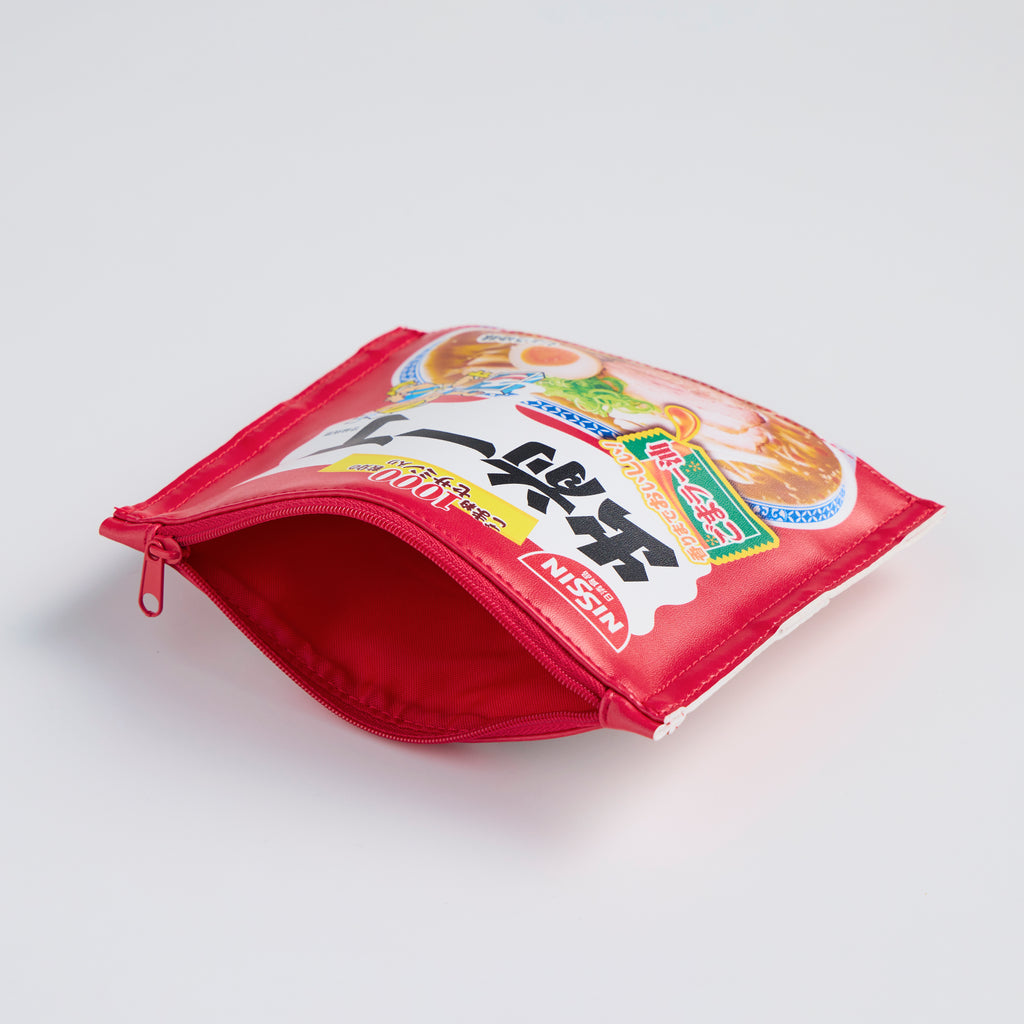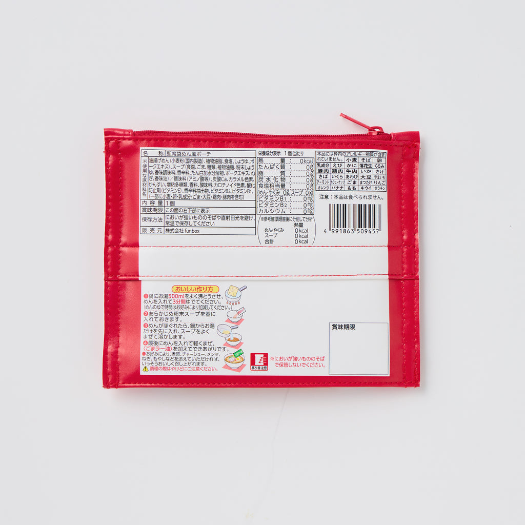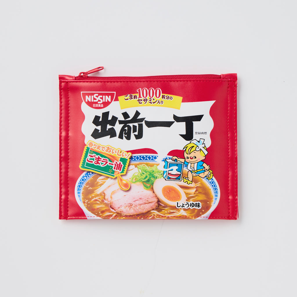 「出前一丁」のパッケージにそっくりなポーチ。 本物とほぼ同じ大きさで、裏面のデザインまで「本物そっくり」にこだわっています。ぜひ本物と見比べてみてください。 マチ付きで、ポーチとしての実用性も高いのもポイント。