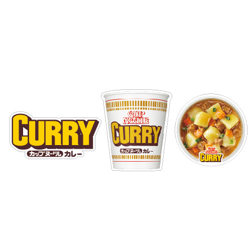 カップヌードルカレーのステッカー3枚セットです。 おなじみのロゴからお腹が空いちゃいそうな柄まで.携帯カバーに挟んだり、お好きな柄を交換したりと楽しみ方は色々!