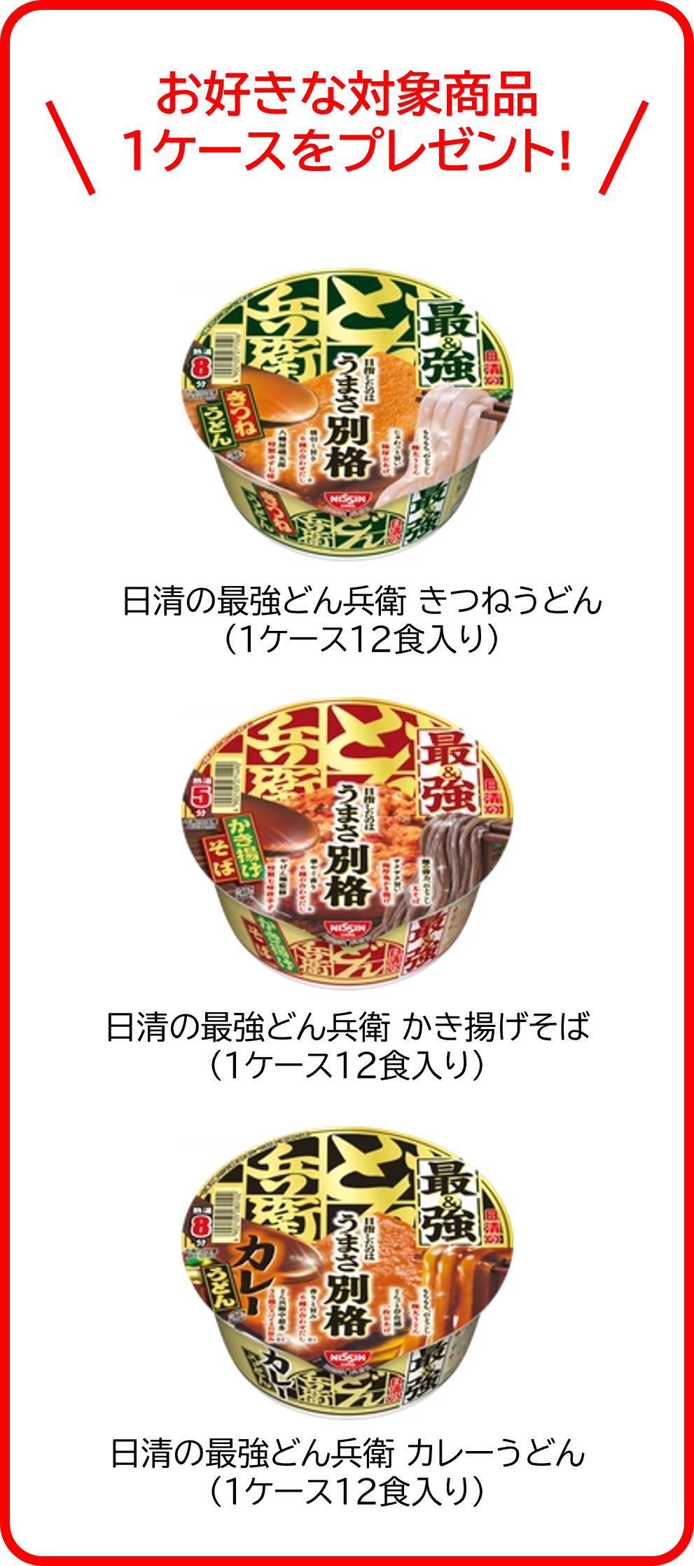 10ケース以上の購入でご利用いただける「大量購入コーナー」にて、商品代金3万円(税込)以上ご購入いただいた方に「日清の最強どん兵衛」3種の中からお好きな商品1ケースをプレゼント!