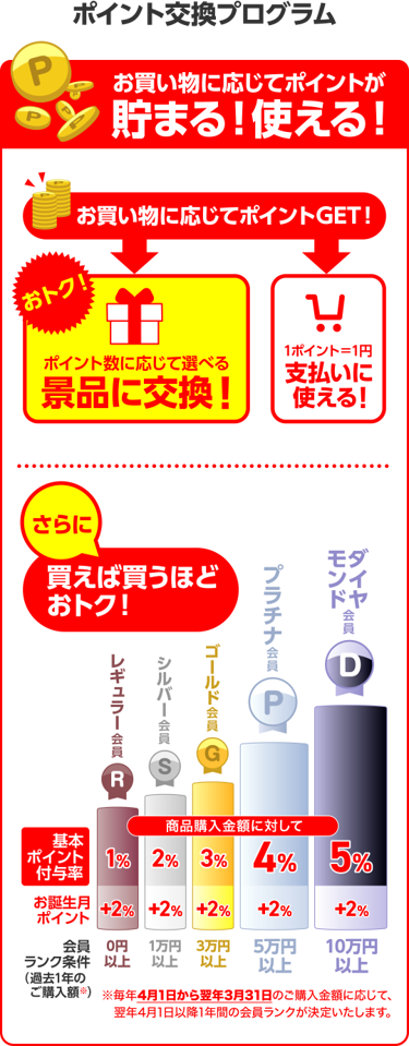 ・商品購入金額 (税込)に対して付与されるポイント数は、100円(税込)以上のご購入で1ポイントが付与され、別途定められた会員ランクによってポイント付与倍率は決定します。