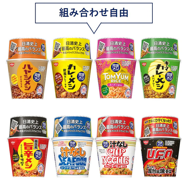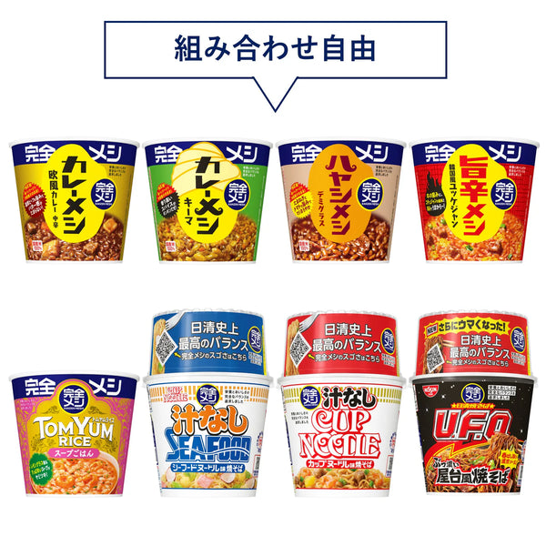 お湯かけ5分で完成する「カレーメシ」「ハヤシメシ」「完全メシ 日清焼そばU.F.O.ぶっ濃い屋台風焼そば 」「完全メシ カップヌードル 汁なしシーフードヌードル」「完全メシ 韓国風旨辛メシ ユッケジャン」「汁なしシーフードヌードル」、「汁なしカップヌードル」「トムヤムライス」からお選びいただけます。