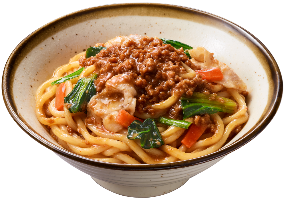 豆板醬のコクとにんにくのうまみがきいたこってり旨辛たれが、もっちりした太麺によく絡みます。チンゲン菜、にんじん、にら、鶏肉、豚肉と具材もたっぷり入った彩り豊かなまぜうどんです。