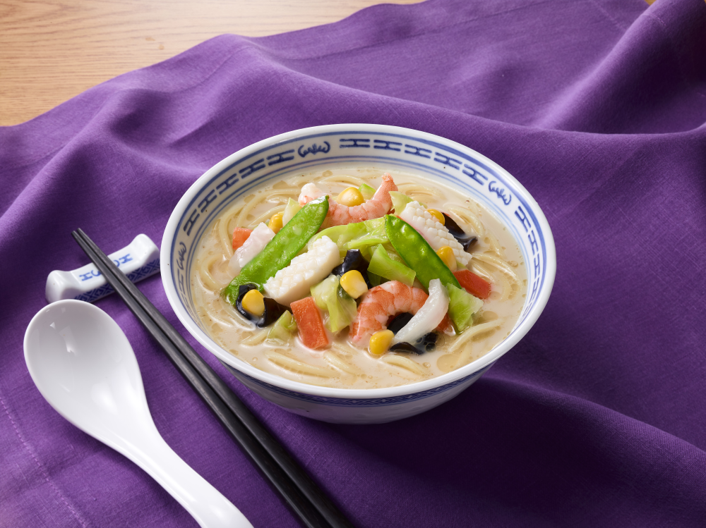 ポークエキスを使用したコクのある白湯スープに、魚介のうまみと炒め野菜の香ばしい風味をきかせた、濃厚な味わいのちゃんぽん。野菜の甘味をアップし、よりまろやかに仕上げました。
