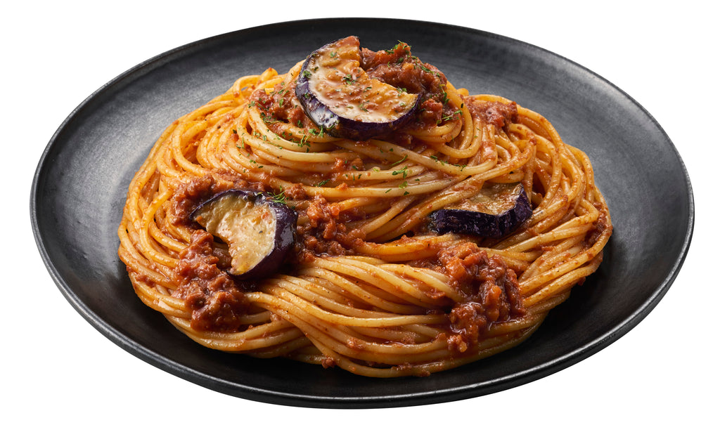 じっくり煮込んだ 2種のひき肉 (牛肉、鶏肉)を使用したボロネーゼ。揚げなすをトッピングしました。ひき肉と香味野菜のうまみが調和したコク深い味わいのソースは、アルデンテ食感のパスタによく絡みます。