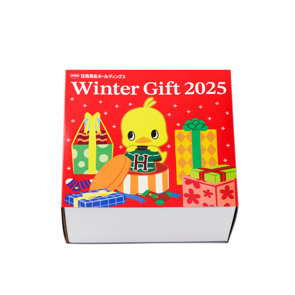 日清食品グループ各社の人気商品や新商品計14品を、ひよこちゃんデザインの化粧箱に詰め合わせた「ウィンターギフト2025」。お歳暮や贈答用にもご利用いただいている人気商品です。数量限定のため、お早めに!